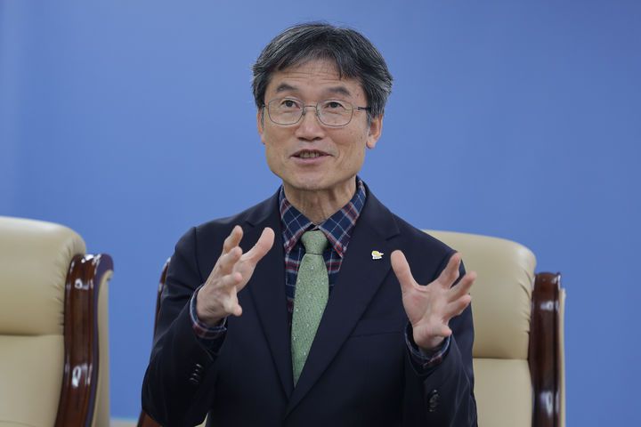 [울산=뉴시스] 구미현 기자 = 천창수 울산시교육감이 취임 2주년 인터뷰에서 올해 주요 교육 정책에 대해 설명하고 있다. (사진=울산시교육청 제공) photo@newsis.com *재판매 및 DB 금지