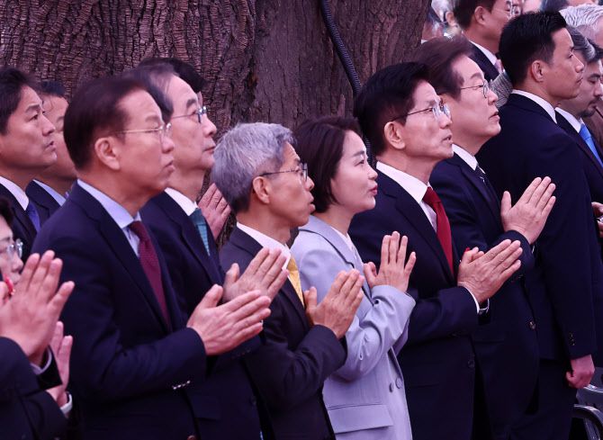 지난 5일 서울 종로구 조계사에서 열린 불기 2569년 부처님오신날 봉축법요식에서 (오른쪽 두번째부터)이재명 더불어민주당 후보, 김문수 국민의힘 후보, 김재연 진보당 후보, 권영국 민주노동당 후보, 한덕수 무소속 후보가 합장하고 있다.(연합뉴스)