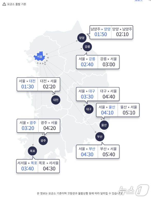 오전 10시 기준 지역 주요 도시에서 서울까지 승용차 운행 시 예상 소요 시간은 △부산 5시간 40분 △울산 5시간 10분 △강릉 3시간 △양양 2시간 10분(남양주 도착) △대전 2시간 20분 △광주 4시간 20분 △목포 4시간 30분(서서울 도착) △대구 4시간 40분이다.