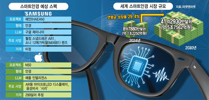 시장조사기관 마켓앤마켓에 따르면, 전 세계 스마트 안경 시장은 작년 기준 8억7880만 달러(약 1조 2250억원)에서 2030년까지 41억2930만달러(약 5조 7562억원)로 성장할 전망이다. 이기간 연평균 성장률은 29.4%에 달한다.