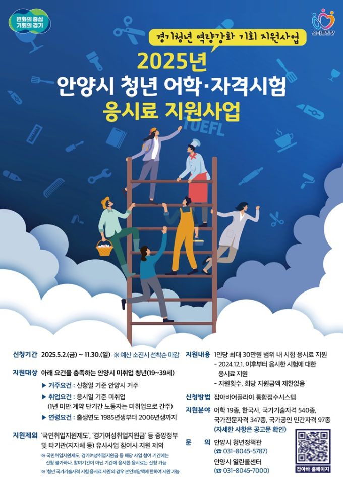 [안양=뉴스핌] 박승봉 기자 = 경기 안양시는 미취업 청년들의 어학·자격시험 응시료를 최대 30만원까지 지원하는 '경기청년 역량강화 기회 지원사업'을 실시한다고 6일 밝혔다.