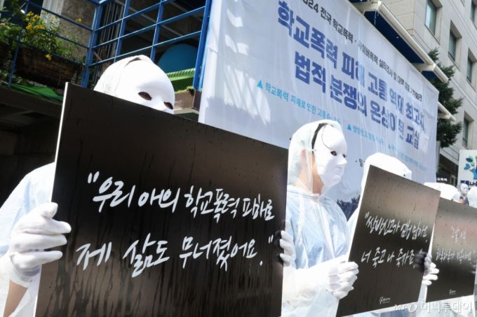 푸른나무재단 직원들이 지난해 7월 24일 오전 서울 서초구 푸른나무재단에서 열린 전국 학교폭력·사이버폭력 실태조사 발표 기자회견에서 학교 폭력을 멈출 것을 촉구하는 퍼포먼스를 하고 있다/사진=뉴스1 /사진=(서울=뉴스1) 신웅수 기자