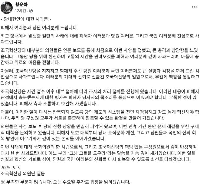 6일 황운하 조국혁신당 원내대표는 페이스북에 조국혁신당 의원단 성명으로 '당내 현안에 대한 사과문'이라는 글을 게재했다.