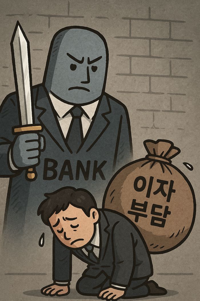 기업 운영에서 한계 상태에 빠진 상장사가 역대 최대로 늘면서 은행권의 기업 신용평가 작업에도 비상이 걸렸다. 이자 부담에 빠진 기업 상황을 AI가 그린 이미지 <챗GPT>