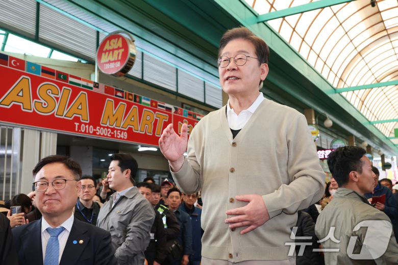 이재명 더불어민주당 대통령 후보가 골목골목 경청투어 이틀차를 맞은 6일 오전 충북 증평군 장뜰시장을 찾아 즉흥 연설을 하고 있다. 2025.5.6/뉴스1 ⓒ News1 안은나 기자 |