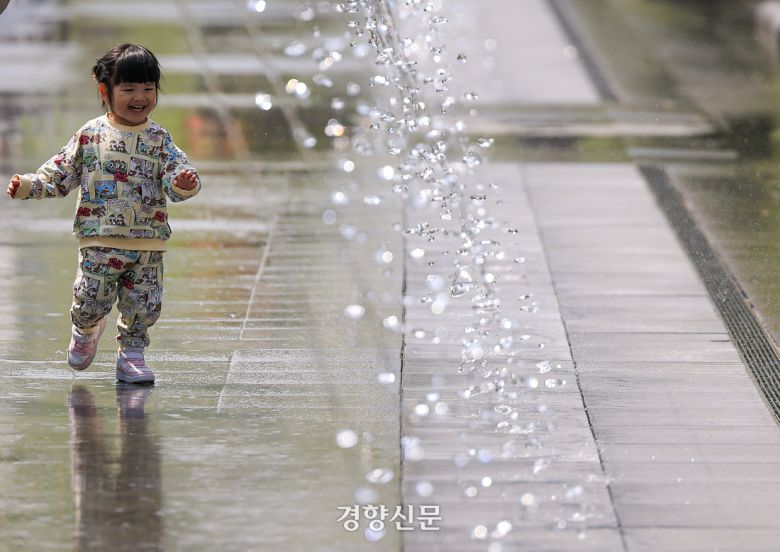 일교차가 커지며 한낮 기온이 20도까지 오를 것으로 예보된 지난달 24일 한 아이가 서울 광화문 광장 분수대를 지나고 있다. 이준헌 기자 |