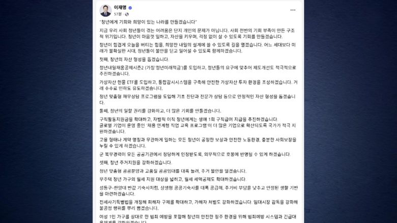 이 후보는 SNS에 올린 청년 정책 발표문에서, 청년이 마음껏 일하고 자산을 키우며 걱정 없이 살 수 있도록 기회를 만들겠다며 이같이 밝혔습니다.