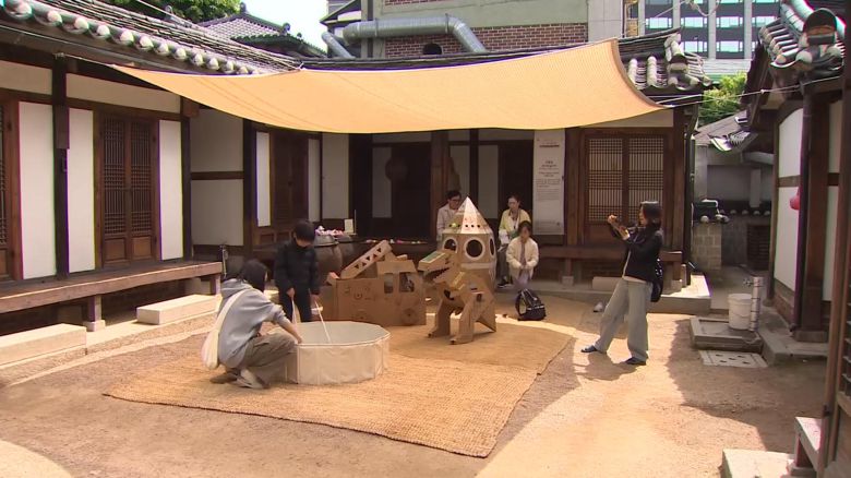 멋스러운 놀이터로 변신한 한옥에 뉴스캐스터가 나가있습니다.