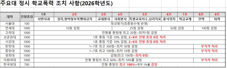 서울대는 모든 처분 결과(1∼9호)를 정성평가로 최종 점수에 반영하고, 연세대 학생부교과 추천형 전형은 1호 처분만 받더라도 지원이 불가능하다. 이 밖에 성균관대와 서강대, 한양대 등 대부분의 주요 대학은 학교폭력 처분을 받은 수험생에게 강도 높은 불이익을 준다.