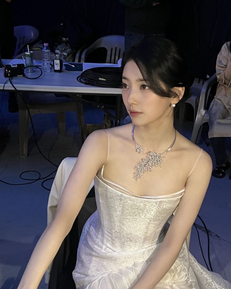 이어 공개된 화이트 드레스는 또 다른 매력을 뽐냈다. 힙 라인이 조각 같은 실루엣을 완성하며 클래식하면서도 독창적인 분위기를 연출했다. 특히 수지가 커튼을 들추며 장난스러운 표정을 짓는 사진에서는 드레스와 그녀의 태도까지 완벽히 어우러져 유쾌한 매력이 돋보였다.