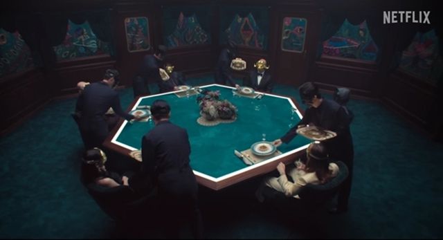 육각형 모양 테이블에 앉아 음식을 기다리고 있는 장면을 보면 금장 가면을 쓴 3명의 남성과 2명의 여성을 확인할 수 있다. 또한 일렬로 도열한 채 어딘가를 응시하는 장면에선 VIP들이 참가자들의 게임 영상을 실시간으로 지켜보는 듯한 느낌을 준다.
