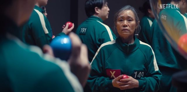 무작위로 빨간 공과 파란 공 중 하나를 뽑아 게임을 진행하며 서로를 죽여야 하는 게임이 진행됨을 암시하는 장면은 이런 가설에 힘을 보탠다. 빨간 공을 뽑은 기훈이 붉은 색 조끼를 입고 게임 공간에서 상대방을 죽인 후 걸어나오는 듯한 장면에선 '무고한 살인은 허용돼선 안 된다'는 그의 철학이 송두리째 무너지는 결과로 이어질 가능성을 보여준다.
