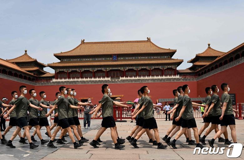 중국 인민해방군 병사들이 2021년 6월 21일(현지시간) 베이징 자금성 입구를 지나 행진하고 있다. ⓒ AFP=뉴스1 ⓒ News1 김지현 기자