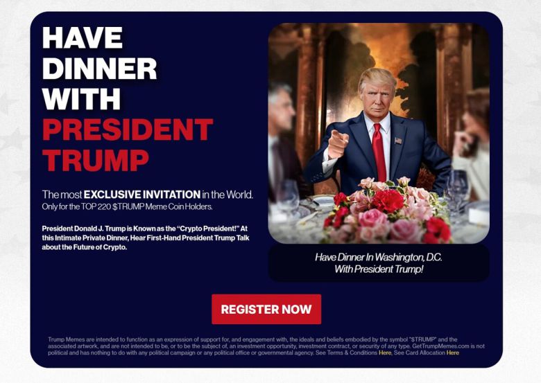 오피셜트럼프 공식 홈페이지인 겟트럼프밈즈는 “오피셜트럼프를 가장 많이 구매한 220명이 트럼프 대통령과 저녁을 먹을 수 있을 것”이란 문구를 첫 페이지 상단에 배치했다. 사진=겟트럼프밈즈 홈페이지 캡처 |