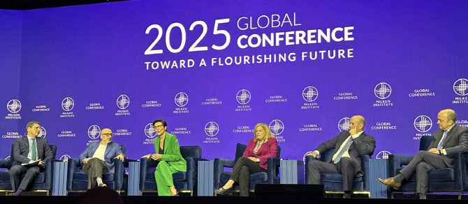 5일(현지시간)2025 밀컨 글로벌 컨퍼런스의 ‘글로벌 캐피털 마켓’ 세션에서 글로벌 투자자들이 도널드 트럼프 대통령의 관세에 대해 성토하고 있다. 왼쪽 두번째부터 왈리드 알 모카랍 알 무헤이리 무바달라 투자회사 그룹 부회장, 제인 프레이저 시티그룹 CEO, 제니 존슨 프랭클린템플턴 CEO, 하비 슈와츠 칼라일 CEO, 앤드루 설리번 프루덴셜 파이낸셜 CEO (사진=김상윤 특파원) |