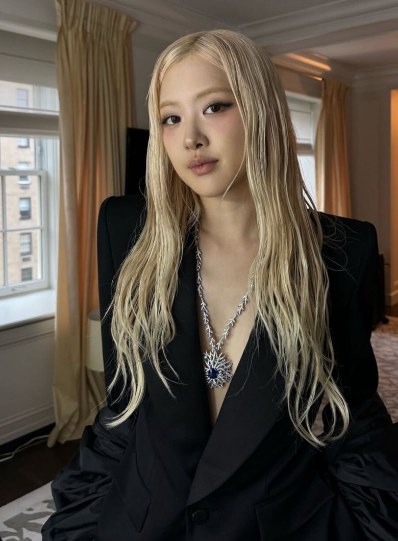 또한 로제는 시크한 블랙 컬러의 과감한 브이넥 재킷을 착용했고, 자신의 시그니처인 금발 헤어스타일로 우아한 모습을 드러냈다.