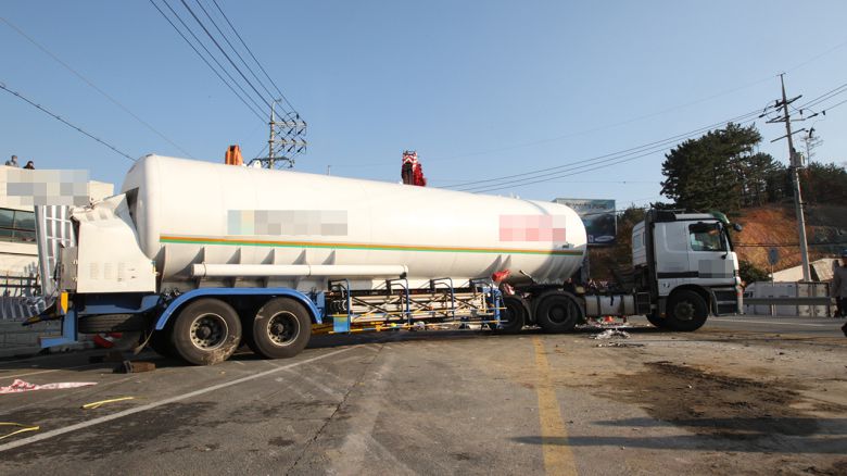경찰과 소방 당국은 사고 지점 인근 34번 국도 양방향을 통제하고 크레인 3대를 동원해 넘어진 탱크로리를 바로 세우는 작업을 하는 중입니다.