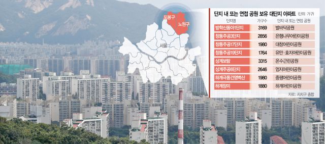 1980년대 택지개발로 상계·중계·하계동에 대단지가 들어선 노원구 역시 같은 요구를 하고 있다. 서준오 서울시의원(더불어민주당)은 지난달 시의회 임시회 주택공간위원회 회의에서 서울시에 공원·녹지 의무 확보 기준의 유연화를 주장했다. 노원구에는 △상계보람(온수근린공원) △상계주공10단지(민들레어린이공원·반디어린이공원·상록수어린이공원) △상계주공6단지(염지어린이공원·소망어린이공원) 등 공원·녹지 연접 단지가 15곳에 이른다.