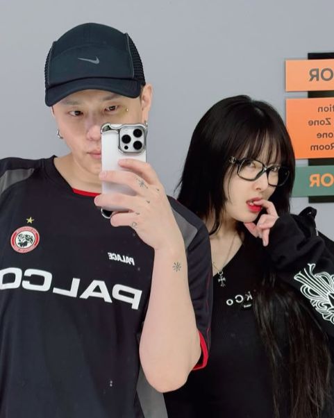 현아는 올 블랙 패션을 완벽하게 소화했고, 그의 옆에는 남편 용준형이 나란히 서서 카메라를 응시하고 있다. 용준형 역시 블랙 의상을 매치해 두 사람의 커플룩이 자연스럽게 어우러졌다.