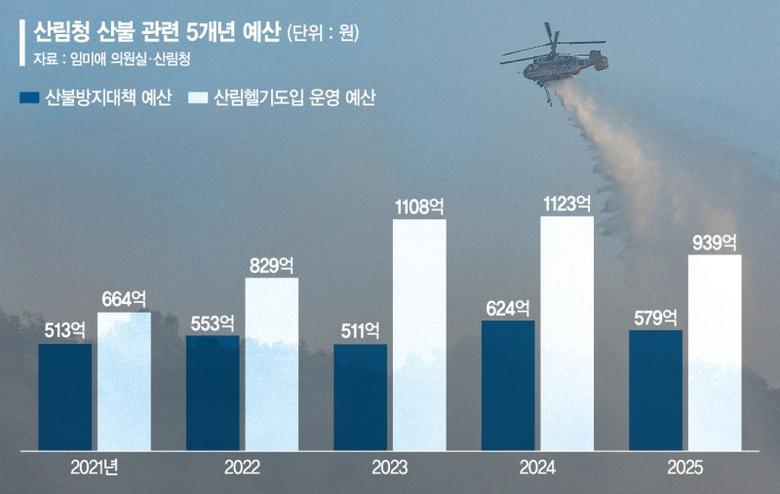 6일 본지가 임미애 더불어민주당 의원실을 통해 산림청으로부터 받은 자료에 따르면 최근 5년간 산불방지대책 예산은 2021년 513억원, 2022년 553억원, 2023년 511억원 등 해마다 600억원을 넘지 못했다.