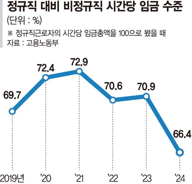 고용노동부의 '고용형태별 근로실태조사'에 따르면 지난해 정규직의 시간당 임금은 2만7703원으로 전년보다 11.7% 증가한 반면, 비정규직은 1만8404원으로 4.7% 증가하는 데 그쳤다. 정규직 대비 비정규직 임금 수준은 66.4%로 떨어지며 2016년 수준으로 되돌아갔다.