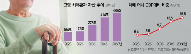 전체 인구의 2%가 조금 넘는 65세 이상의 고령 치매 환자들이 보유한 자산인 ‘치매 머니’가 국내총생산(GDP)의 6.4% 수준인 154조 원에 달하는 것으로 나타났다. 고령화로 치매 인구가 급증할 것으로 예상되면서 이들이 보유한 자산이 2050년에는 GDP의 15.6%인 500조 원에 이를 것이라는 전망도 나온다. 고령 치매 환자가 사기 등 피해에 노출될 경우 경제에 미치는 파급력이 큰 만큼 정부는 치매 머니 관리책 등을 포함한 대책 마련에 속도를 내기로 했다.