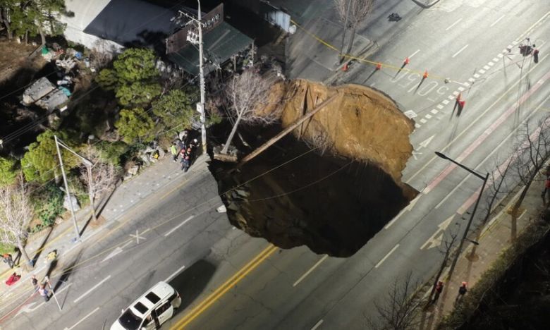 지난 3월24일 저녁 서울 강동구 명일동 대명초교 사거리 인근에서 대형 땅꺼짐 사고가 발생해 경찰과 소방이 현장을 통제하고 있다. 김영원 기자 forever@hani.co.kr |