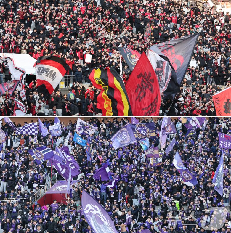 22일 오후 서울 마포구 서울월드컵경기장에서 하나은행 K리그1 2025 2라운드 FC서울과 FC안양의 경기에서 FC서울(위)과 FC안양 팬들이 각각 열띤 응원전을 펼치고 있다. 2025.2.22/뉴스1 ⓒ News1 신웅수 기자