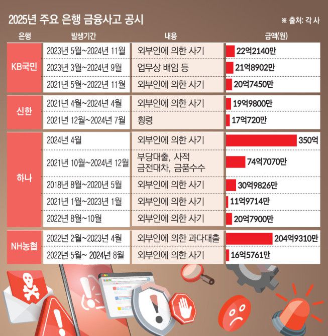 최근에는 ‘외부인에 의한 사기’ 금융사고가 잇따라 적발되는 추세다. 일부 은행이 “해당 외부인 형사고소밖에 할 수 있는 조치가 없고 은행에 책임을 묻기 어렵다”며 내부통제 책임을 회피하는 양상도 보인다. 5대 은행이 올해 공시한 금융사고 12건 중 9건이 ‘외부인에 의한 사기’로 집계됐다.