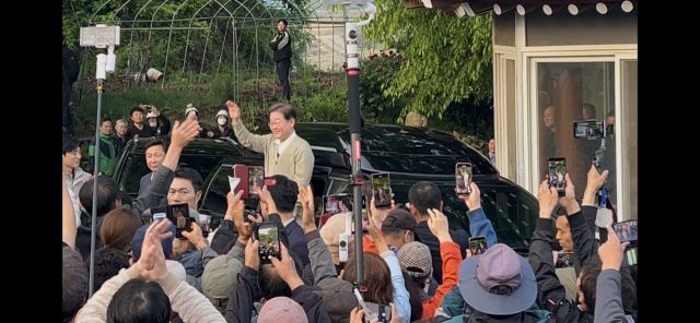 이재명 후보는 차량에서 내려 환하게 웃으며 '대통령'을 연호하는 주민들과 악수를 한 후 정민수 이장과의 간담에 들어갔다.