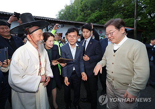 (장수=연합뉴스) 류영석 기자 = 더불어민주당 이재명 대선 후보가 '골목골목 경청투어:국토종주편'에 나선 6일 전북 장수군 오옥마을을 찾아 주민 어르신들과 인사하고 있다. 2025.5.6