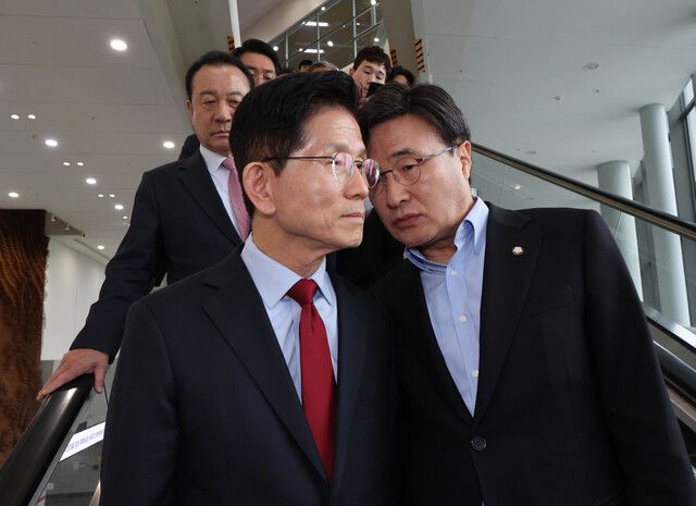 국민의힘 김문수 대선 후보(맨 앞 왼쪽)가 6일 아시아태평양경제협력체(APEC) 회의장인 경북 경주시 경주화백컨벤션센터를 방문, 초선·재선 대표인 김대식 의원과 대화를 나누고 있다. 김 후보는 후보 일정을 중단하고 서울로 올라가 현안 문제에 대한 대책을 마련하겠다고 밝힌 뒤 자리를 떠났다.연합뉴스