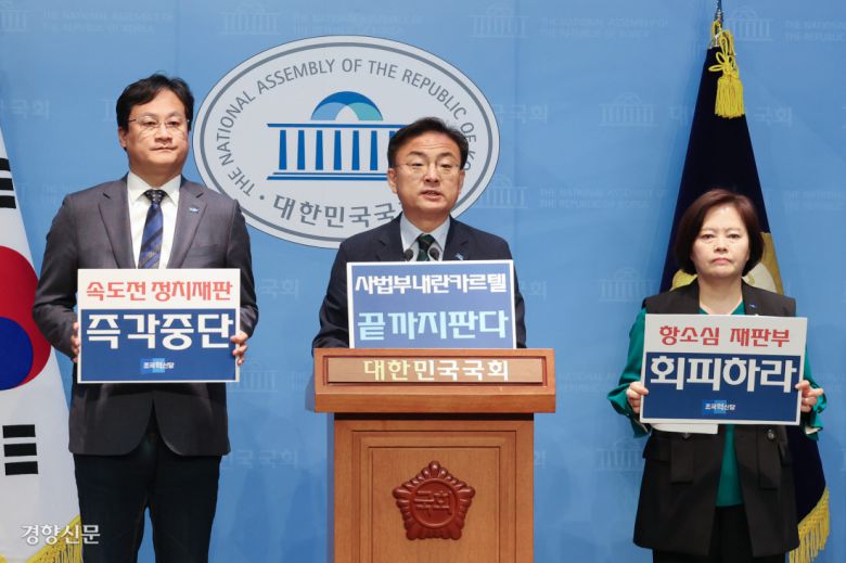 혁신당 “정치재판 중단” 조국혁신당 끝까지 판다 위원회 신장식 의원(가운데) 등이 6일 국회 소통관에서 기자회견을 열고 이재명 더불어민주당 대선 후보에 대한 파기환송심과 관련해 ‘속도전 정치재판’ 중단 등을 촉구하고 있다. 한수빈 기자