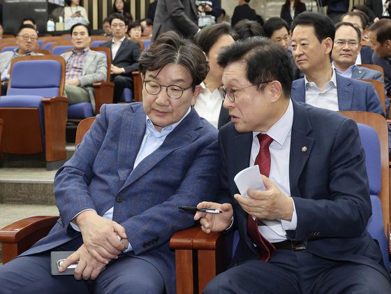 권성동 국민의힘 원내대표(왼쪽)와 박형수 원내수석부대표가 6일 오후 국회에서 열린 의원총회에서 회의 시작 전 대화하고 있다. 임현동 기자 |