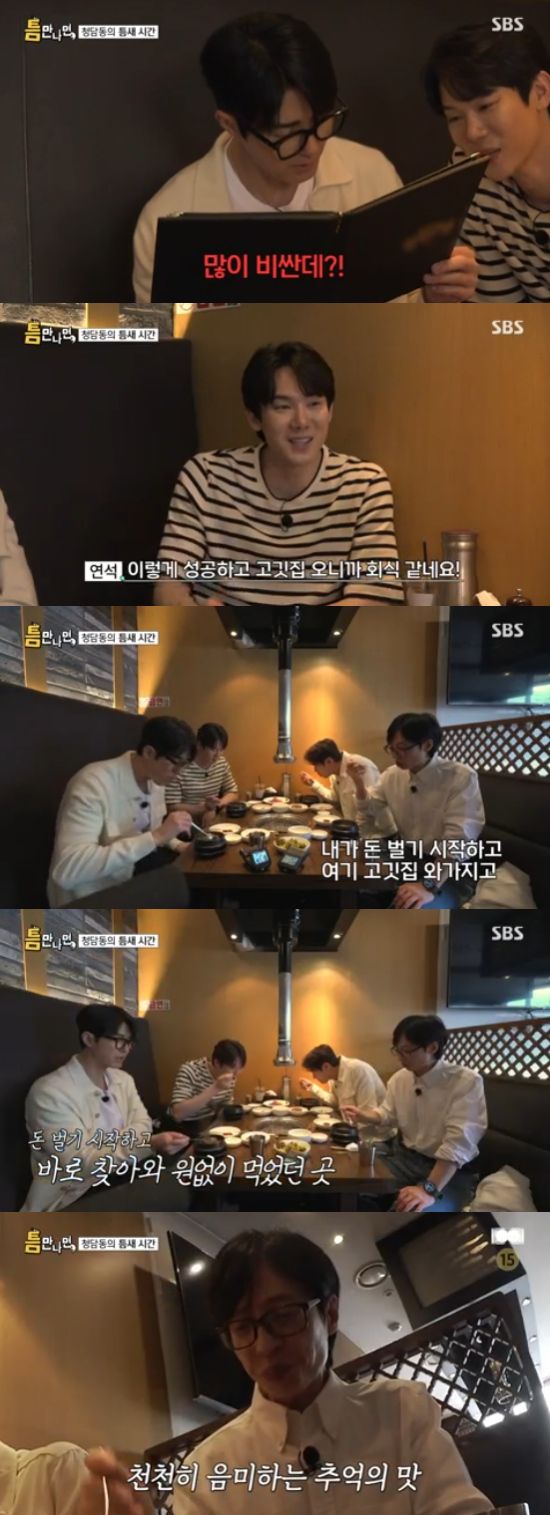 유재석은 고기를 먹으면서 "돈을 벌기 시작하고 여기 고깃집을 와서 머릿 속으로 가격 계산을 안하고 먹었다. 옛날에는 계속 (얼마가 나올지) 계산을 했었다"고 추억에 잠겨 눈길을 끌었다.