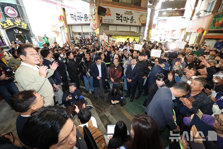 [증평=뉴시스] 조성봉 기자 = 민심을 청취하는 '경청 투어'에 나선 이재명 더불어민주당 대선후보가 6일 충북 증평군 장뜰시장에서 시민들에게 인사를 하고 있다. (공동취재) 2025.05.06. photo@newsis.com