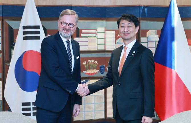 안덕근 산업통상자원부 장관(오른쪽·당시 통상교섭본부장)이 지난 2022년 10월27일(현지시간) 체코 프라하 주체코 한국 대사관 접견실에서 페트르 피알라 체코 총리와 면담에 앞서 악수하고 있다. (사진=산업부)