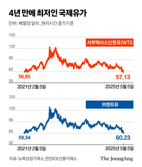5일(현지시간) 주요 외신에 따르면 이날 뉴욕상업거래소에서 6월 인도분 서부텍사스산 원유(WTI)는 전 거래일 대비 1.16달러(1.99%) 떨어진 57.13달러에 거래를 마쳤다. 런던 ICE선물거래소에서 7월물 브렌트유도 1.06달러(1.73%) 내린 배럴당 60.23달러로 마감했다. WTI와 브렌트유 모두 2021년 2월 이후 가장 낮다.