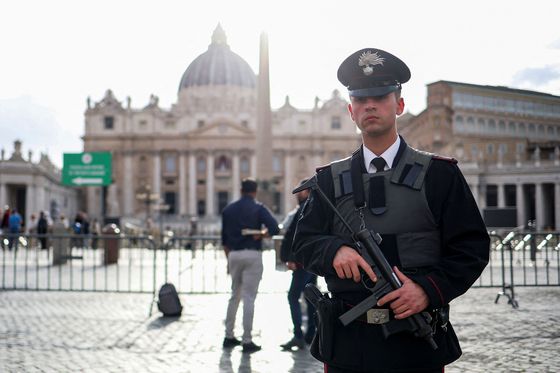 이탈리아 군사경찰이 5일(현지시간) 바티칸 성 베드로 광장을 지키고 있다. [로이터=연합뉴스] |