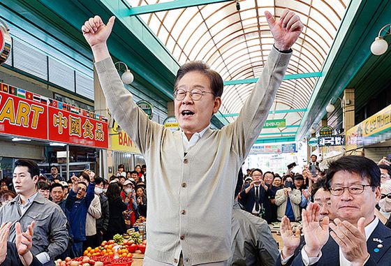 이재명 더불어민주당 대선후보가 6일 오전 충북 증평군 장뜰시장을 방문해 지지자들을 향해 두 손을 들어 인사하고 있다. 이 후보는 이날 “12·3 내란도 이겨냈고 2차, 3차 내란 시도도 우리 국민의 위대한 손길에 의해서 진압될 것으로 확신한다”고 말했다. [뉴시스]