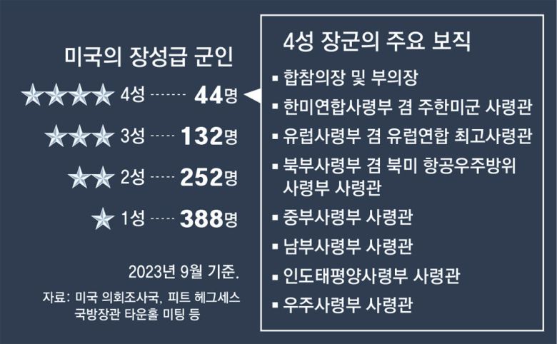지난해 3월 미 의회조사국이 발표한 ‘미군 내 장성 및 제독급 장교 현황’ 보고서에 따르면 2023년 9월 기준 미군의 현역 장성급 장교는 총 800여 명. 이 중 4성 장군은 44명인 것으로 알려졌다. 의회조사국이 관련 통계를 집계하기 시작한 1965년과 비교하면 전체 병력 중 4성 장군의 비율은 2023년 2배 이상 증가했다. 전체 병력 중 장성급 장교 비율 역시 1.3배 정도 늘었다.