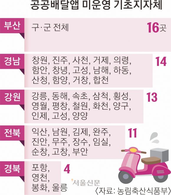 문제는 일부 지역에서는 공공배달앱 서비스가 없어 할인 혜택을 받을 수 없다. 국회예산정책처에서 발표한 ‘2025 제1회 추가경정예산안 분석’을 보면 공공배달앱을 운영하지 않는 전국 기초지자체는 58곳이다. 지역별로 부산 16곳, 강원 13곳, 경남 14곳, 전북 11곳, 경북 4곳이다.