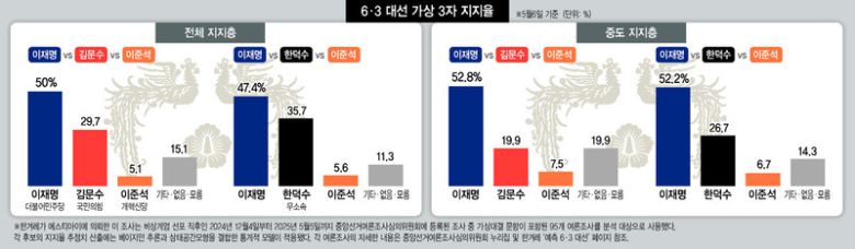 한겨레와 에스티아이가 지난해 12월4일부터 최근까지 중앙선거여론조사심의위원회에 등록된 95개 여론조사를 종합해 추출한 대선 지지율 예측 조사 결과, 이재명 후보는 김문수 국민의힘 후보, 이준석 개혁신당 후보와의 3자 대결(6일 기준)에서 지난주보다 3%포인트 오른 50%의 지지율을 기록했다. 김 후보는 5%포인트 오른 29.7%, 이준석 후보는 2.9%포인트 하락한 5.1%였다. 김문수 후보 대신 한덕수 후보를 넣은 3자 대결에서는 이재명 후보가 47.4%의 지지율을 보였고, 한 후보가 35.7%, 이준석 후보가 5.6%였다. 이재명 후보는 지난주보다 1.3% 하락했고, 한 후보와 이준석 후보는 각각 4.4%포인트, 0.3%포인트 상승했다.