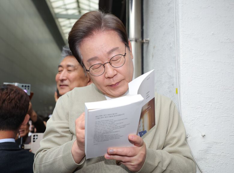 이재명 더불어민주당 대통령 후보가 ‘골목골목 경청투어: 국토종주편’에 나선 6일 충북 옥천군 옥천공설시장에서 한 지지자가 가져온 이 후보의 저서 ‘결국 국민이 합니다’에 사인을 하고 있다. 연합뉴스 |