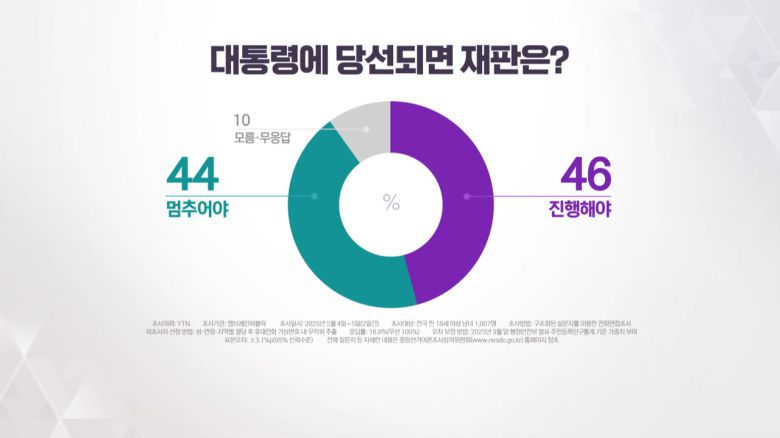 대통령이 되면 재판을 멈춰야 한다는 응답이 44%, 그대로 진행해야 한다는 46%로, 오차범위 안에서 찬반 양론이 팽팽했습니다.