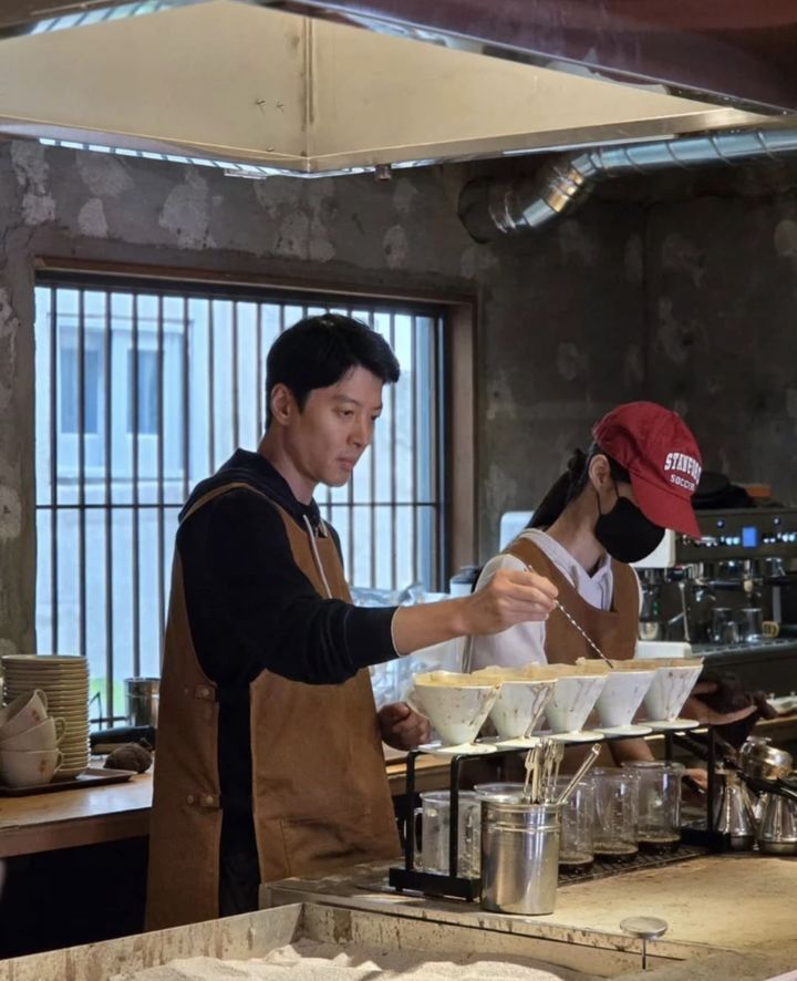 사진 속 이동건은 자신이 운영하는 카페에서 커피를 만드는 모습이다.