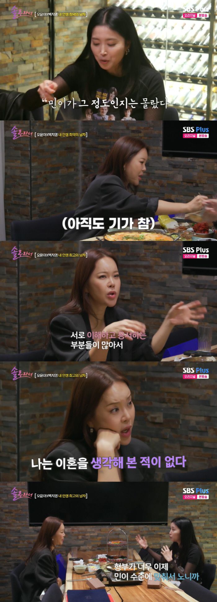 6일 방송된 SBS Plus, E채널 '솔로라서'에서는 절친한 사이인 백지영과 오윤아의 만남이 그려졌다.