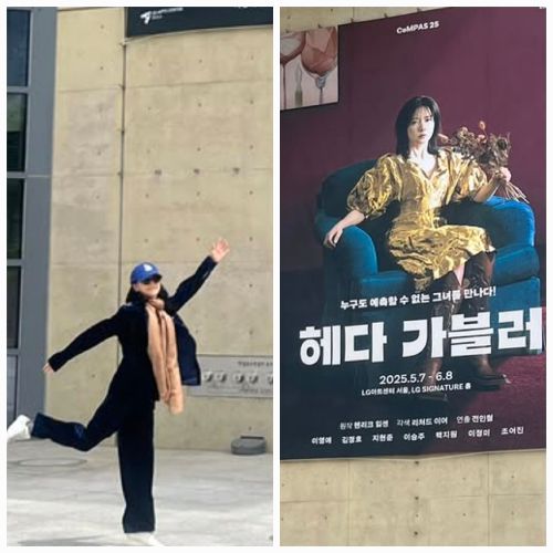 배우 이영애가 무대 위 ‘헤다’와 현실 속 ‘영애’ 사이를 자유롭게 넘나들었다. 금빛 드레스를 입고 소파에 앉은 연극 포스터 속 그녀와, 야구모자 쓰고 하트 날리는 실제 모습 사이엔 드라마보다 더 드라마 같은 간극이 있었다.