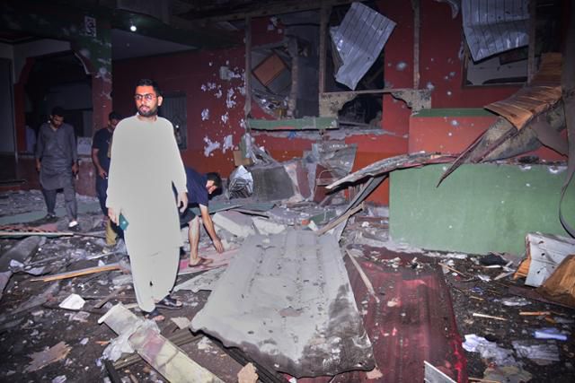 인도가 미사일 공격을 가한 7일, 파키스탄령 잠무카슈미르의 주도 무자파라바드의 한 건물에서 주민들이 공격으로 인한 피해 현황을 살펴보고 있다. 무자파라바드=AP 연합뉴스 |