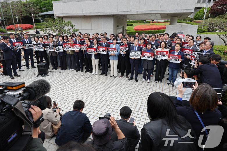 더불어민주당 의원들이 2일 오후 서울 서초구 대법원을 찾아 이재명 더불어민주당 대통령 후보 공직선거법 위반 혐의 사건 상고심 파기 환송 규탄 기자회견을 하고 있다. 대법원 전원합의체는 지난 1일 이 후보의 공직선거법 위반 혐의 사건 상고심에서 무죄인 원심을 깨고 유죄 취로 사건을 서울고법으로 돌려보냈다. 2025.5.2/뉴스1 ⓒ News1 신웅수 기자